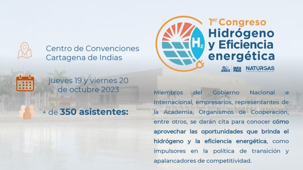 La Asociación Nacional de Empresarios de Colombia (ANDI) y la Asociación Colombiana de Gas Natural (Naturgas) realizaron el 1er Congreso de Hidrógeno y Eficiencia Energética el 19 y 20 de octubre de 2023 en el Centro de Convenciones de Cartagena de Indias, un espacio en el que se abordó los avances de Colombia en la materia y la importancia de estos elementos para la transición energética, la descarbonización y la competitividad.